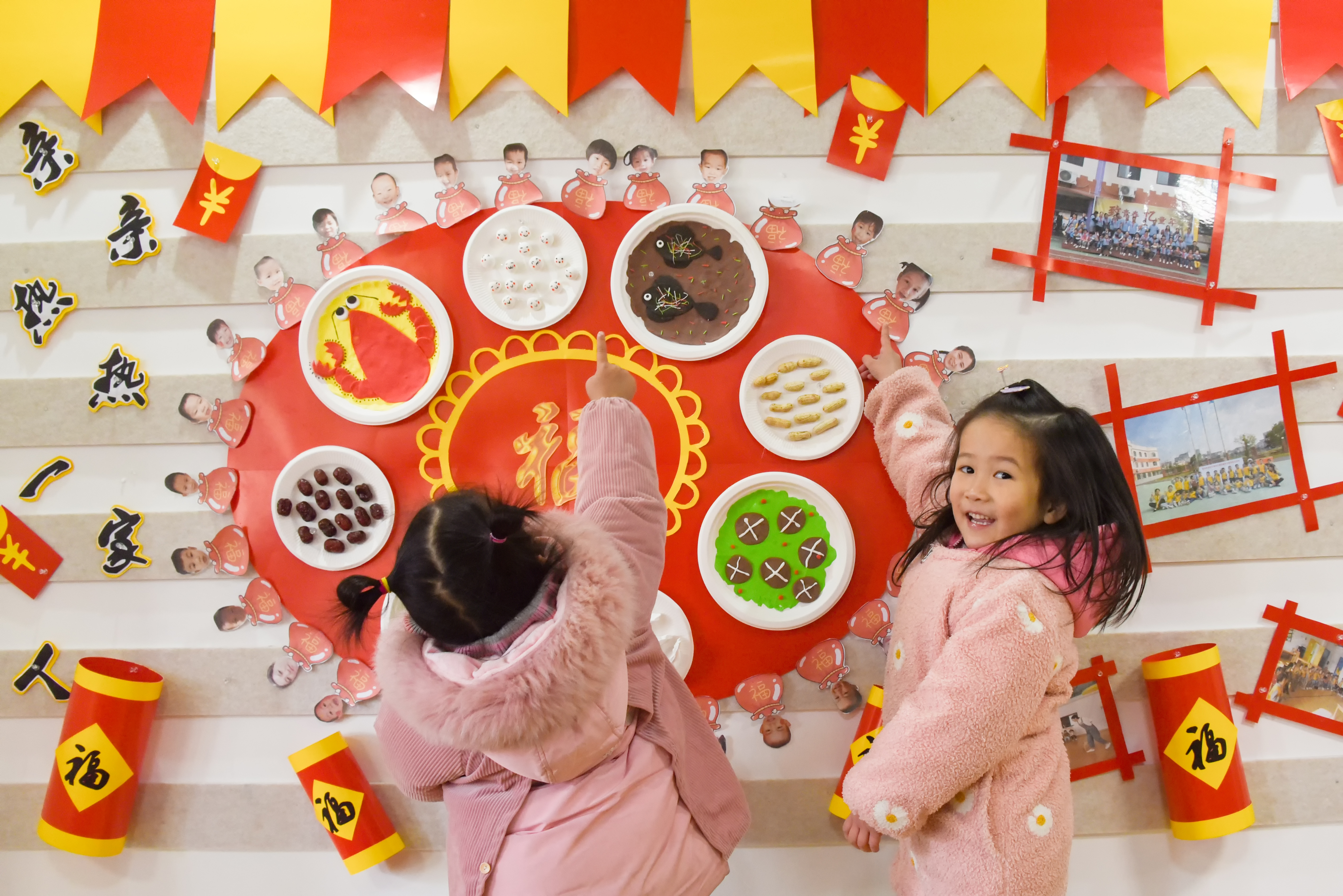 近日,江西省吉安市遂川县城南实验幼儿园老师带孩子在新年主题墙前学春节民俗。