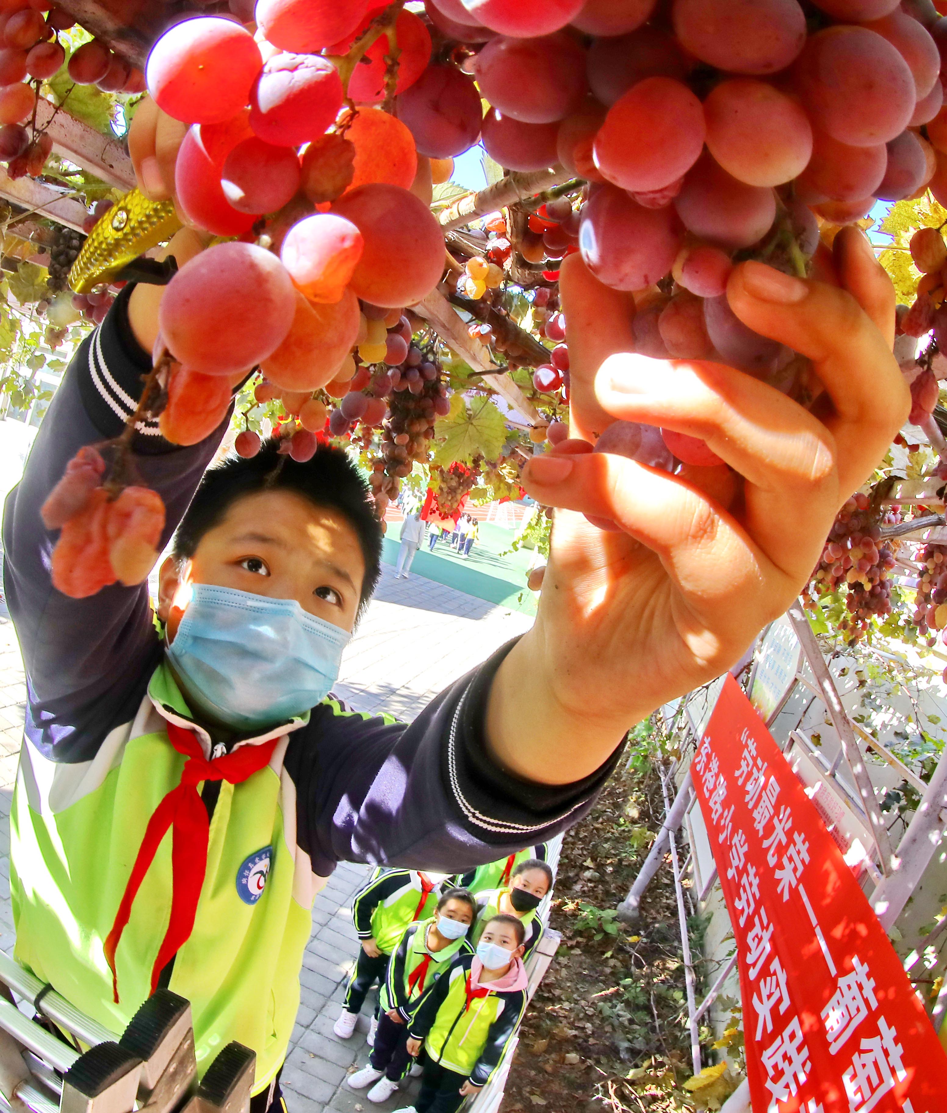 10月12日,河北省秦皇岛市海港区东港路小学学生体验采摘葡萄。近日,海港区东港路小学校园内的果蔬迎来“丰收季”。该校学生在指导教师的带领下在校园的果园内学习采摘葡萄和剪枝,体验收获的乐趣。