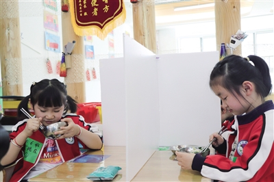 5月11日,安徽省合肥市幼儿园(含看护点)开学,根据幼儿家长意愿实行按需弹性入园。图为当日合肥幼教集团包河欣星幼儿园内,小朋友在装有挡板的桌子上用餐。