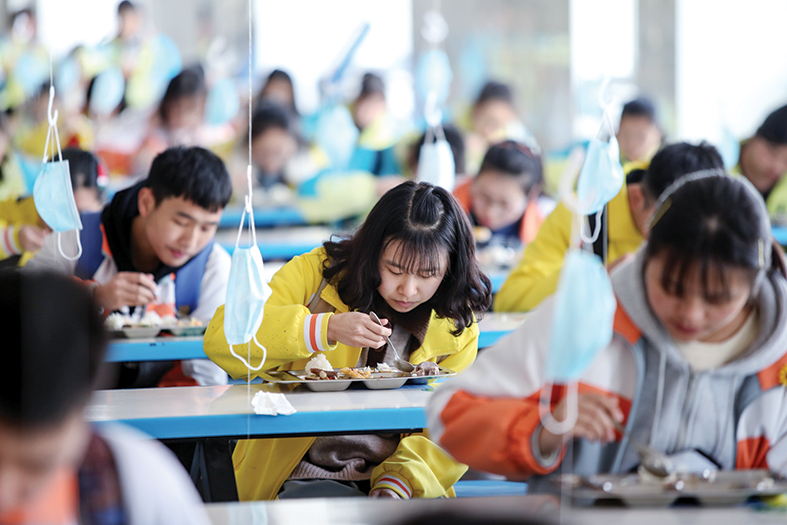 贵州省遵义市湄潭县求是高级中学,多措并举,确保疫情防控和教育教学两不误。其中高三学生在食堂就餐时将口罩挂在挂钩上被摄影师纪录了下来。