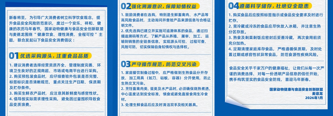 近日,为守护公众“舌尖上的团圆”,引导科学健康的消费理念,麦德龙与国家动物健康与食品安全创新联盟(CAFA)正式携手发布《关于马年春节期间食品安全与健康膳食的联合倡议》,为消费者提供全流程的食品安全指引,推动新利网络娱乐场开户注册 形成“健康饮食、理性消费、全程可控”的共识。
