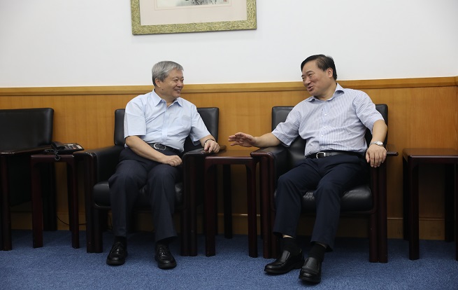 上海市委常委、浦东新区区委书记翁祖亮(右一)与原国家质检总局总工程师、中国质量万里行促进会会长刘兆彬(左一)会前交流
