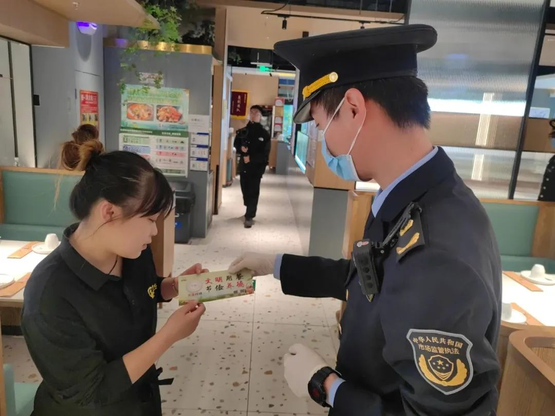检查中,执法人员重点检查了经营户落实反食品浪费责任情况,严格对照检查记录表,围绕食品安全管理情况开展日常检查。对餐饮场所未在取餐处醒目位置张贴或者摆放反食品浪费标识以及光盘行动海报、未能正确履行反食品浪费提醒义务的行为,根据相关法律法规的规定,现场下达责令改正通知书,责令商家限期对问题进行整改。并向经营者宣传《中华人民共和国反食品浪费法》等相关规定,引导餐饮服务经营者提供小份菜,分餐服务,公筷公勺、光盘行动等反食品浪费相关宣传,确保珍惜粮食、制止餐饮浪费的节约理念融入到经营过程当中,推进反食品浪费工作落到实处。