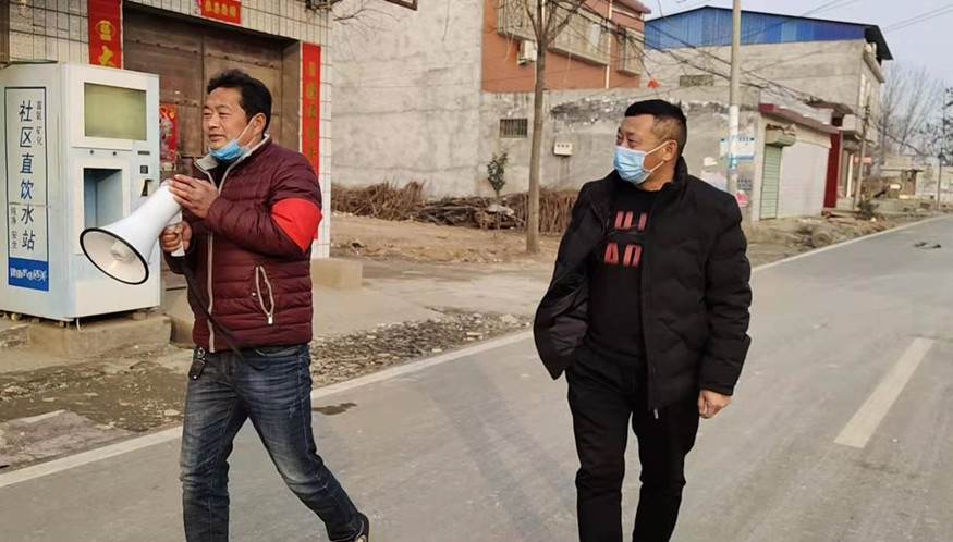 河南郏县白庙乡谢招村村干部在村中巡查并宣传疫情防控知识