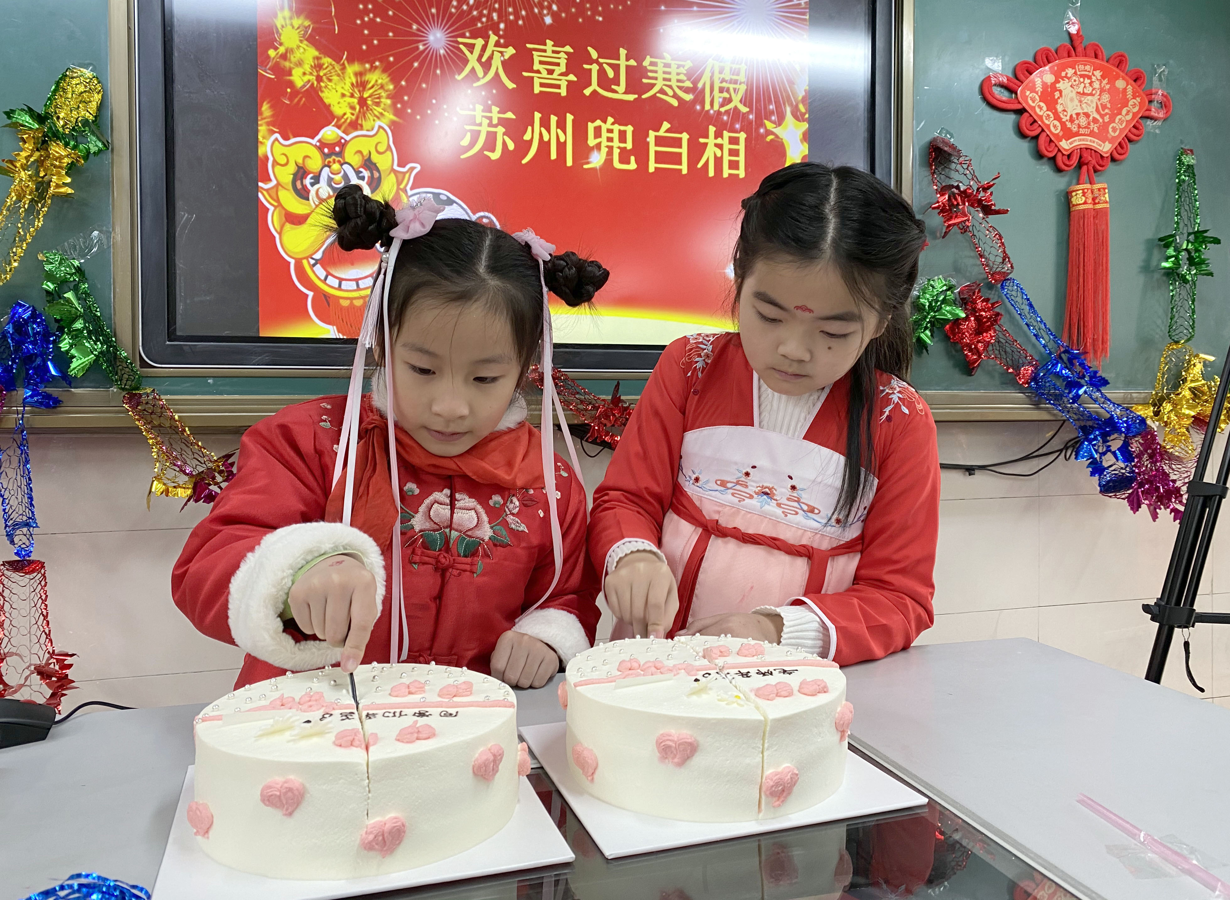 1月25日,江苏省苏州市阳光城实验小学校举办“欢喜过寒假 苏州兜白相——寻味苏式过年新玩法”休业式活动,学校针对在苏州工作的外乡员工子女多的情况,向学生们介绍苏州过年风俗和苏式过年新玩法,号召学生与家人留在苏州度过寒假生活,尽享苏式美味,开启一段美好“食”光。图为当日该实验小学的学生在切蛋糕。王建康 摄
