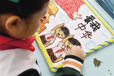 近日,随着“双减”政策的推进落实,山东省青岛市大名路小学将手工制作与劳动课堂相结合,让孩子们通过认识作物、学搓玉米、贴米粒画等方式以“指尖”画意展示丰收景象,体验劳动带来的乐趣。