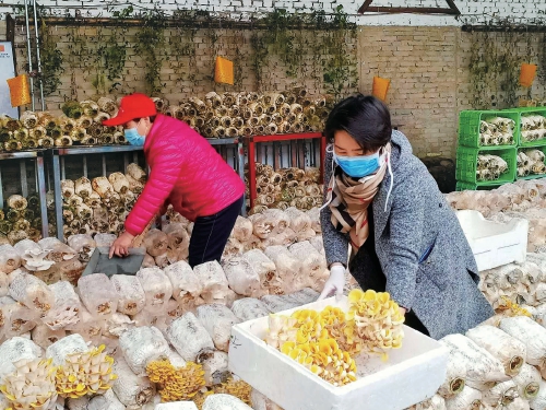 近日,在京郊怀柔区庙城镇的北京桃山月亮湖种植养殖专业合作社的食用菌大棚里,一袋袋榆黄菇色泽饱满,长势喜人。为了做好对员工的健康防护,合作社紧绷安全这根弦,大棚里少了往日密集的劳作场景,社员们自觉戴着口罩和手套分散开劳作。(魏明俊)