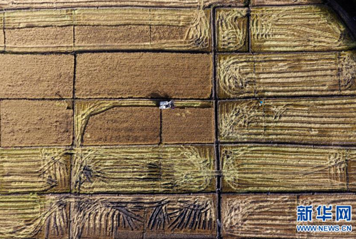 金秋时节,山西省太原市晋源区2000多亩水稻迎来收获季,田间地头稻浪滚滚,一派丰收景象。(新华社记者詹彦)